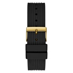 Sport meets Glam with this versatile Guess Chrono look style watch featuring a gold-tone case with a black nylon top ring on a black silicone strap.