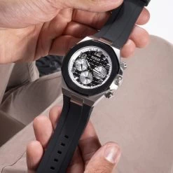 The watch is equipped with a quartz timepiece.