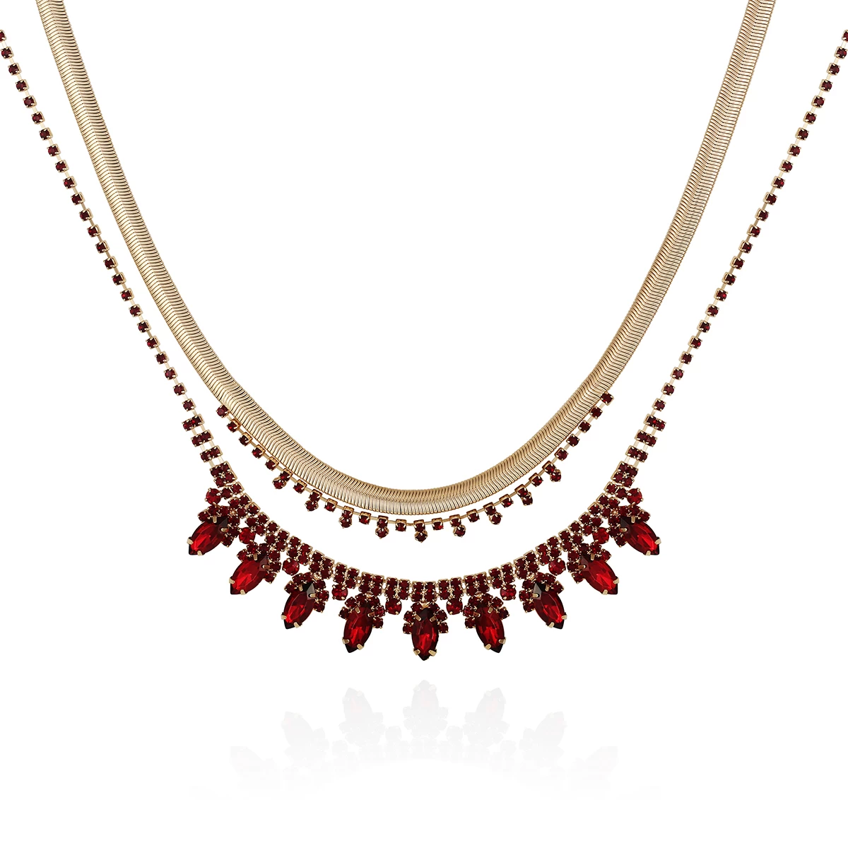 Make a statement with this set of 2 necklaces from Guess. A delicate row of siam stones dangle from a snake chain and siam navette stones accent a row of siam stones. Lobster clasp closures. Gold-tone mixed metal and glass stones.