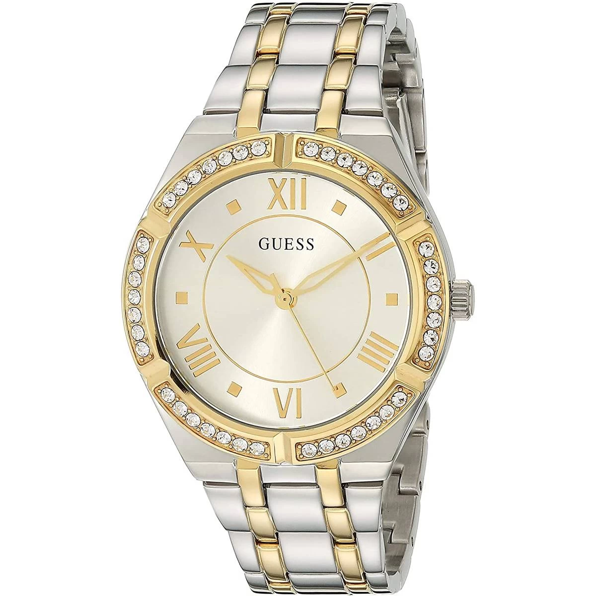 This Guess gold-tone stainless steel watch with sparkling crystals pairs effortlessly with any look giving you the gift of glam. It features an analog function with second-hand sweep, polished steel and gold-tone case, bracelet with crystals around the bezel, and is water-resistant up to 30M. Limited Manufacturer’s Warranty.