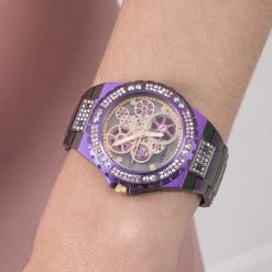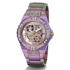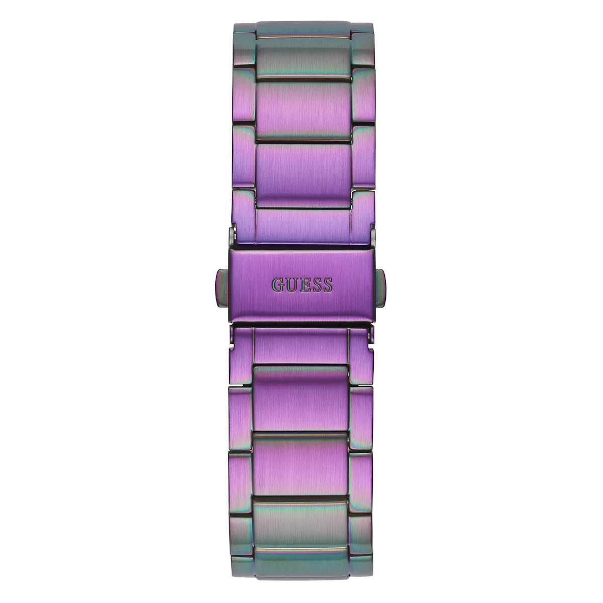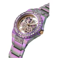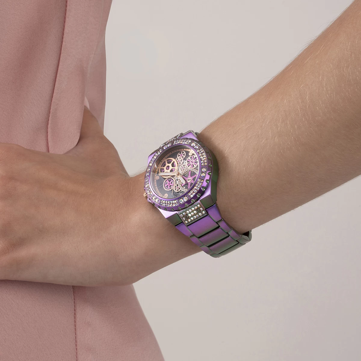 Our biggest reveal yet, this Guess watch features a clear-cut view of both its movement and your wrist and has double the glitz throughout its bezel and bracelet connection with our signature iridescent plating. Rose gold-tone accents on the dial. 39mm stainless steel case with a pilot buckle clasp. Band