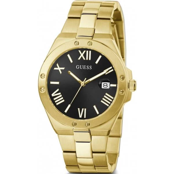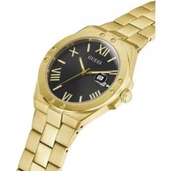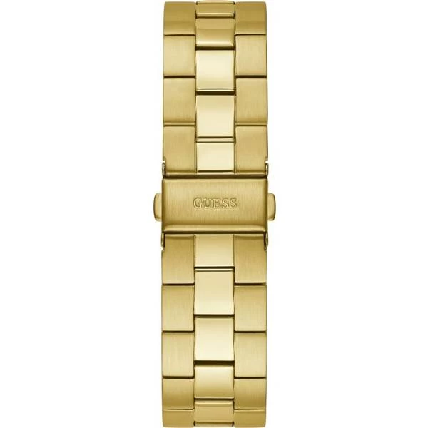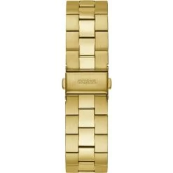 A watch for men from Guess which runs on batteries. Just swap them out if the watch stops. Swimming with this watch should be fine based on its 5 atm (50m) water protection. The gold strap is made from stainless steel. The case is 9 mm thick and the watch face is 41 mm in diameter.