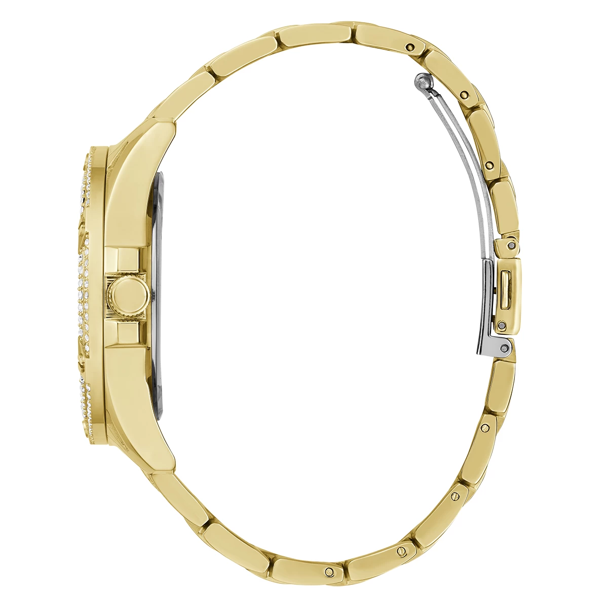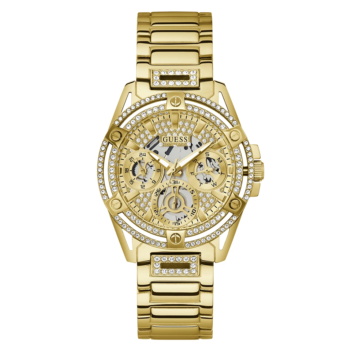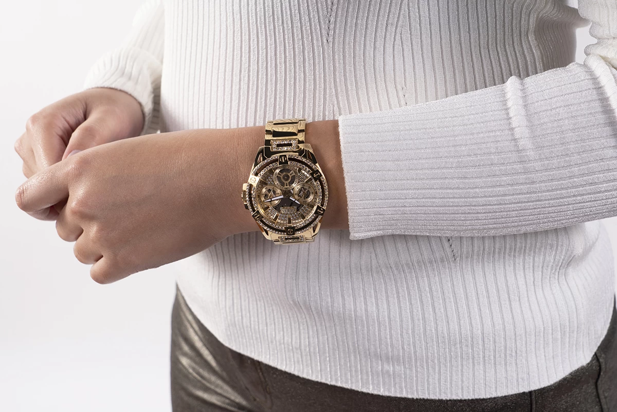 This new take on a classic style the Guess Queen stainless steel watch has a cutting-edge design with all-over cut-thru details from the case to the bracelet as well as integrated on the dial design where you can see thru to the movement of this multi-function watch. Bringing bling elements to a new level with case and bracelet adornment and glitz powder on the dial to give an overall look of luxury. Gold-tone stainless steel 40MM case with a pilot buckle clasp. Water resistant up to 30M.