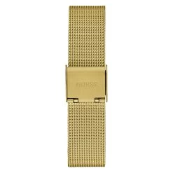 The alluring case design of the Guess Watches® gold tone stainless steel watch showcases a triangle logo that has a full glitz look with a tonal dial and a sleek self-adjustable mesh bracelet.