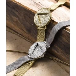 Iconic in every way, this dazzling Guess Watches® silver case stainless steel watch has a triangle dial inset with full glitz and is paired with a sleek mesh bracelet with self-adjustable links.
