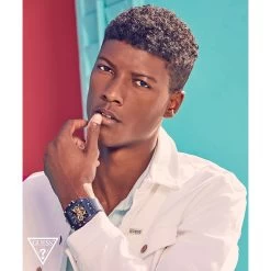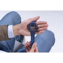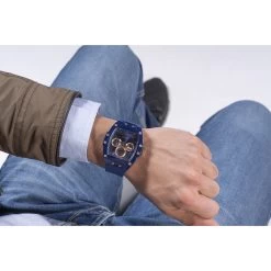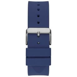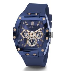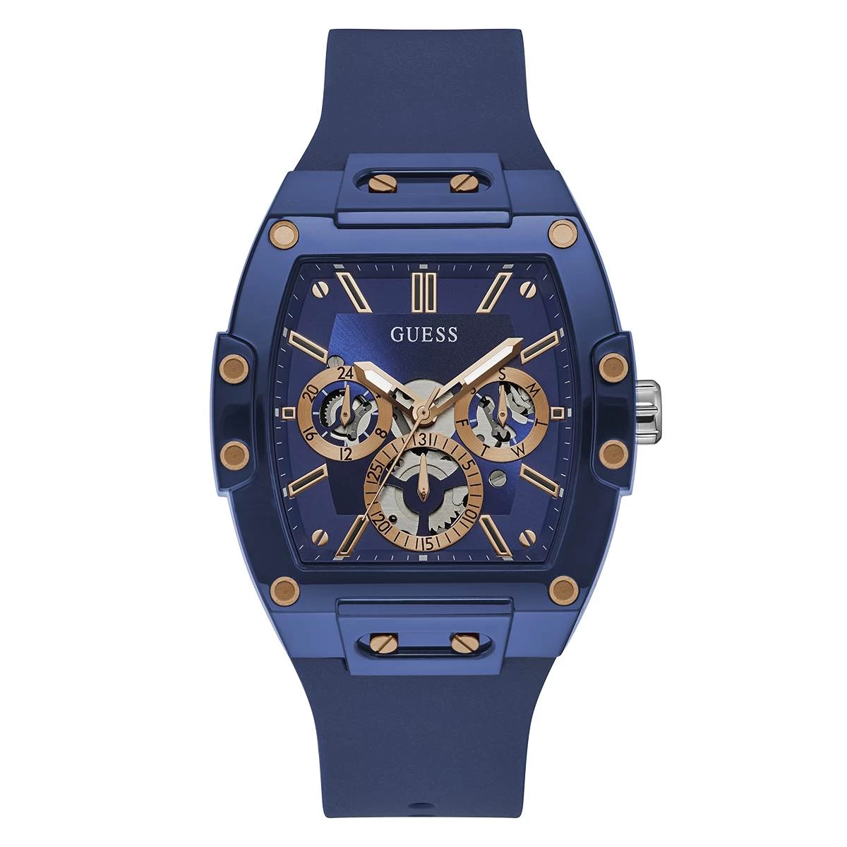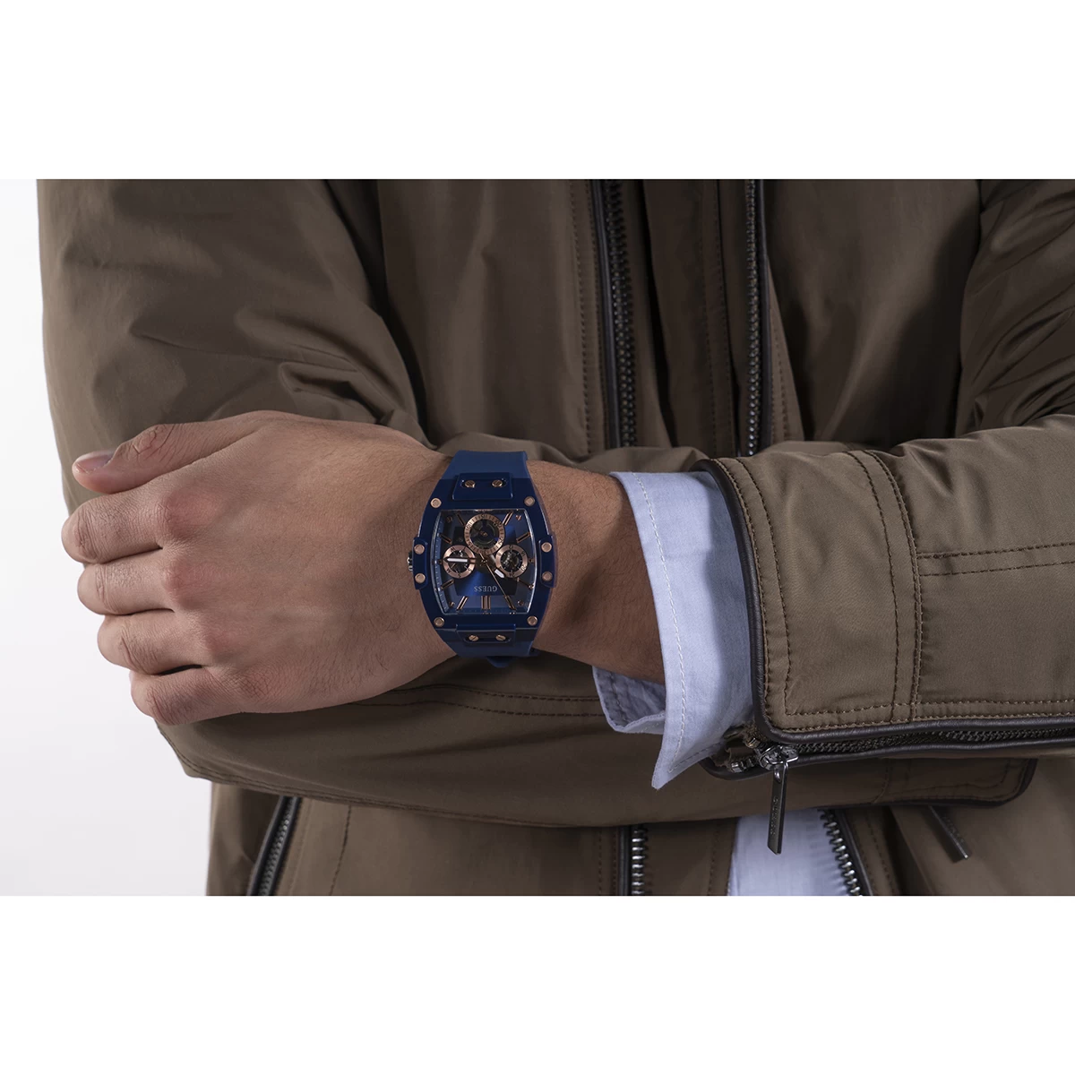 Skeleton dial details keep this phoenix on the rise. This Mens Guess style features a nylon barrel-shaped case with rose gold screw details and a blue multi-function dial and rose gold accents paired with a blue silicone strap. Stainless steel case back. Watch is 50m water resistant.