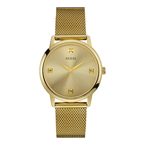 This mens Guess gold-tone slim watch features a polished gold-tone steel case that measures 40mm by 10mm, and an analog dial. The gold-tone mesh steel bracelet finishes off the look. It is water-resistant up to 50 meters.Style U0280G3.Limited Manufacturer’s Warranty.