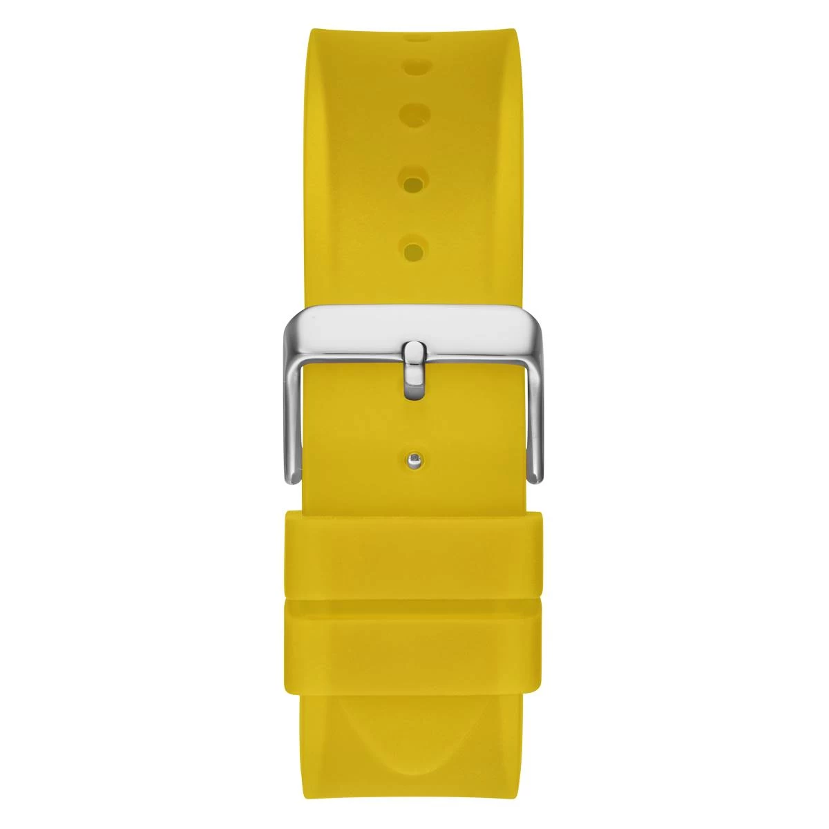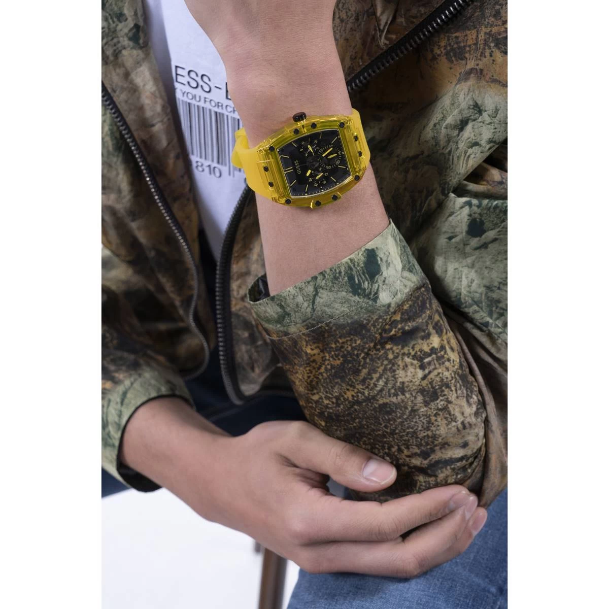 Skeleton dial details keep this Mens Guess watch on the rise. This style features a yellow nylon barrel shaped case with black screw details and a black multi-function dial paired with a yellow translucent silicone strap.