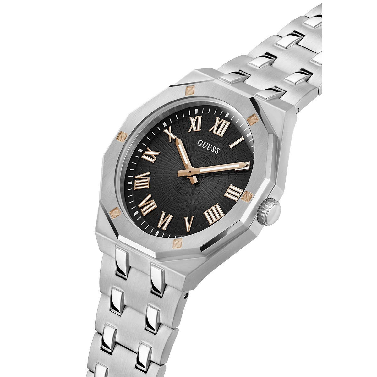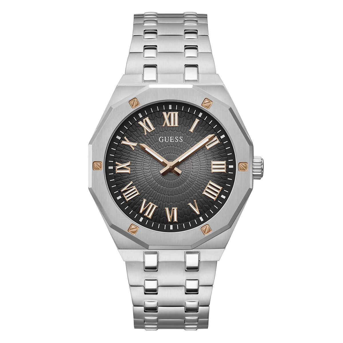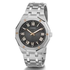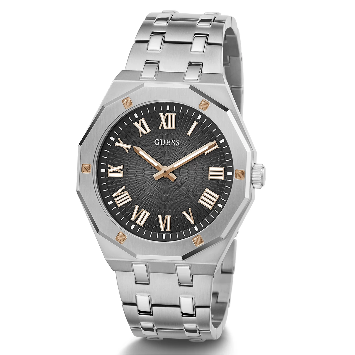 An asset to any man’s wardrobe, this stunning Guess octagonal case design with screw details features an upscale dial design with roman numerals and a brushed and polished bracelet. 42mm stainless steel case and strap. Pilot buckle closure. Water resistant to 50m.