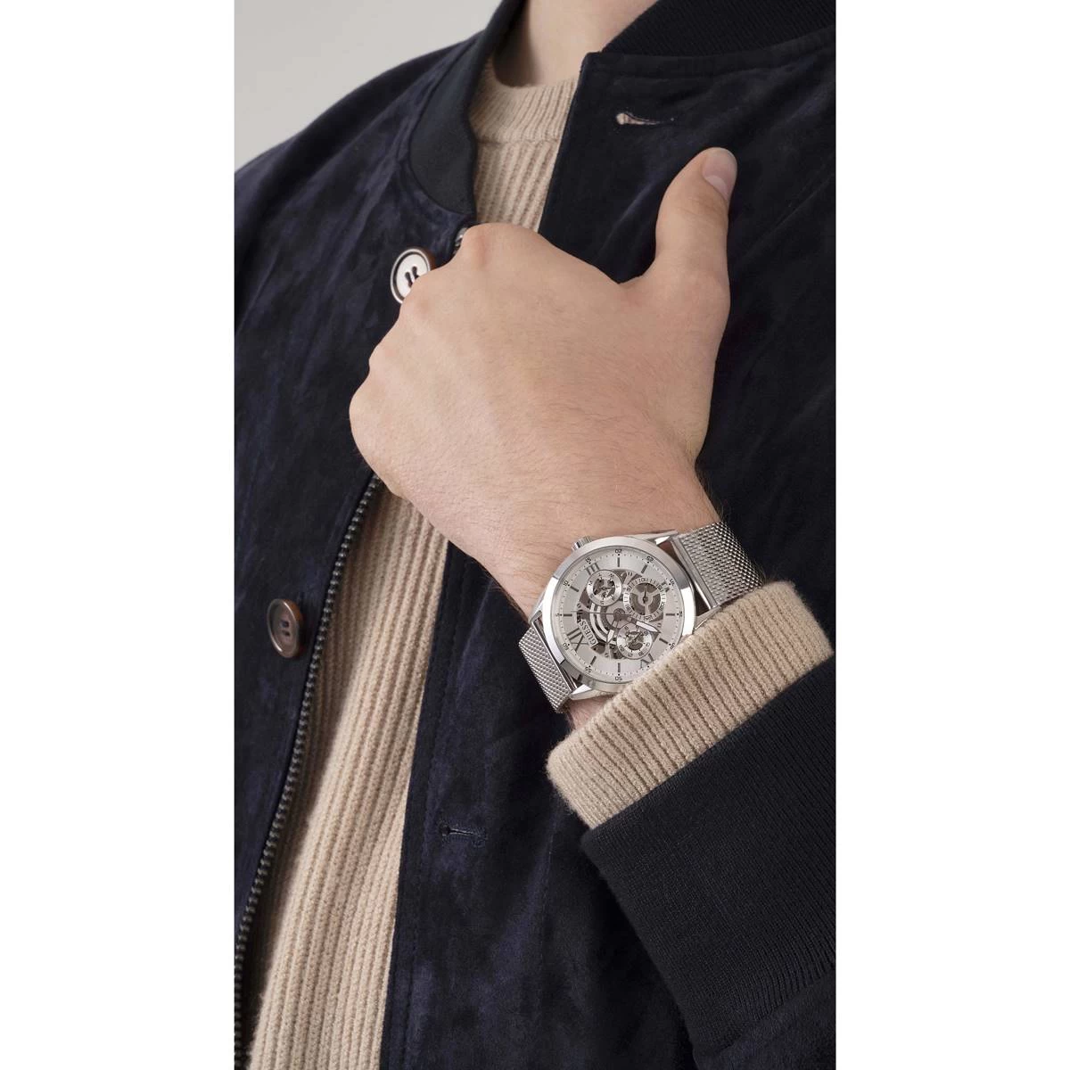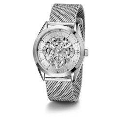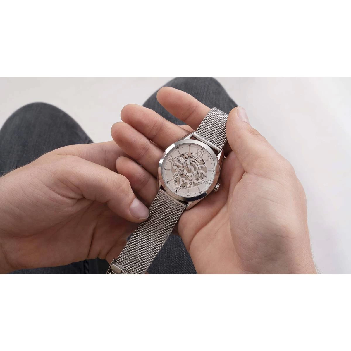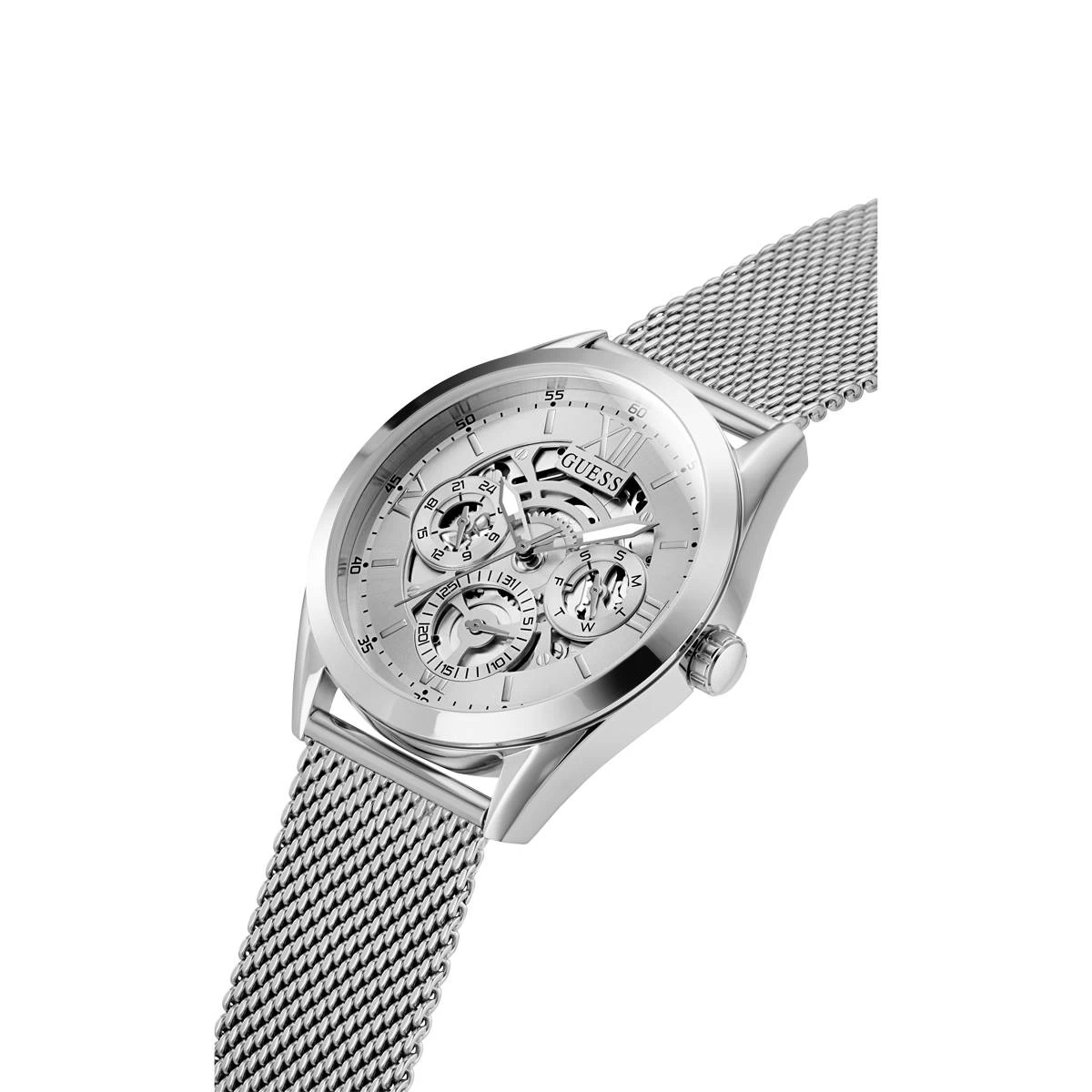 Style meets functionality with this Mens Guess multi-function style with skeleton details that showcase the movement of the watch. Stainless steel matte case and mesh strap with hook slide closure.Band