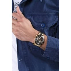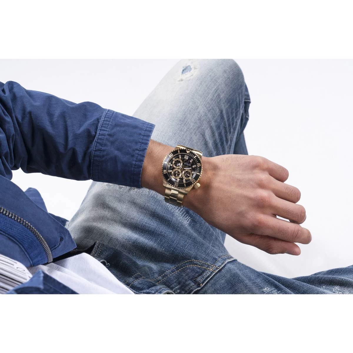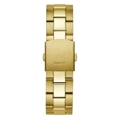 Firing on all cylinders, this bold design Mens Guess Watches® gold case stainless steel watch has it all! It features a stainless steel case with an aluminum top ring along with a cut thru multi-function dial with an asymmetrical crown for a unique design aesthetic.