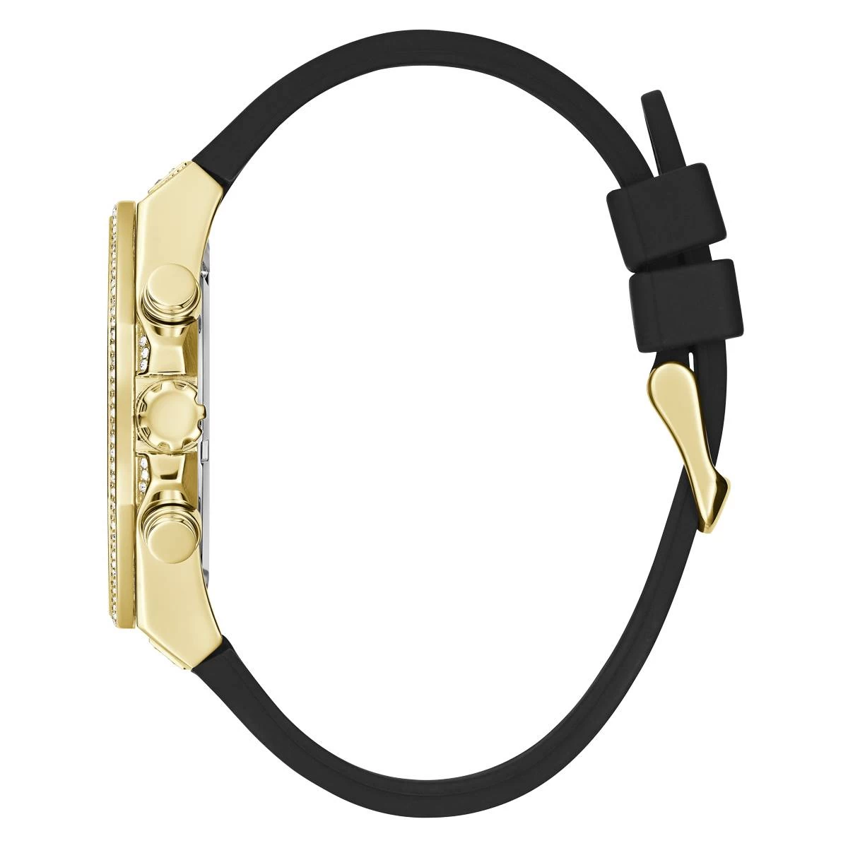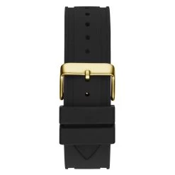 The Mens Guess Watches® gold-tone case black silicone watch gives you the momentum to propel through your day. This fully encrusted octagonal crystal bezel is completed with a chrono-look multi-function dial and cut-thru details that coordinate with a cut-thru silicone strap.