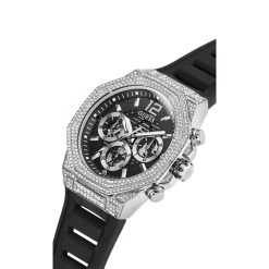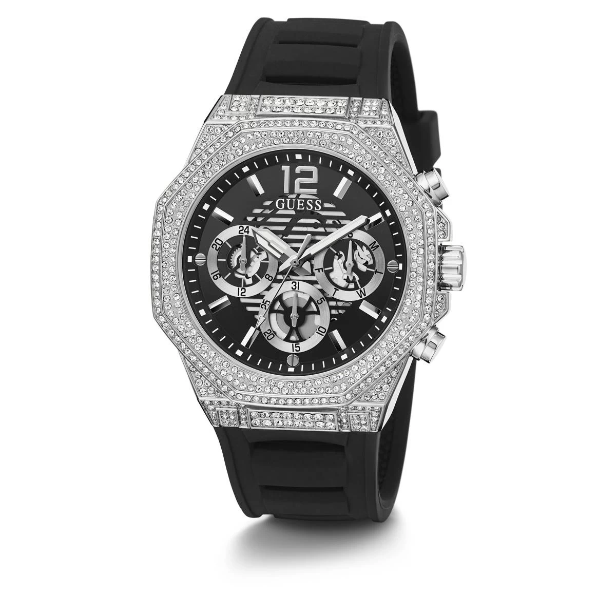 This Mens Guess Watches® silver-tone case black silicone watch gives you the momentum to propel through your day. This fully encrusted octagonal crystal bezel is completed with a chrono-look multi-function dial and cut-thru details that coordinate with a cut-thru silicone strap.