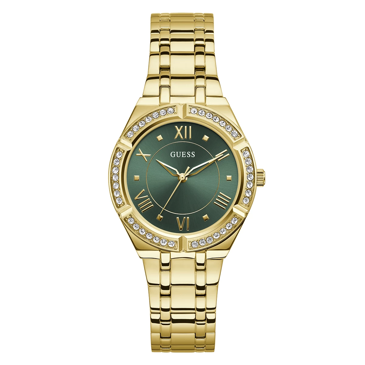 A sports watch with sparkling crystals pairs effortlessly with any look giving you the gift of glam! Gold-tone 36mm stainless steel case with green dial. Pilot buckle clasp. Water resistant up to 30M.